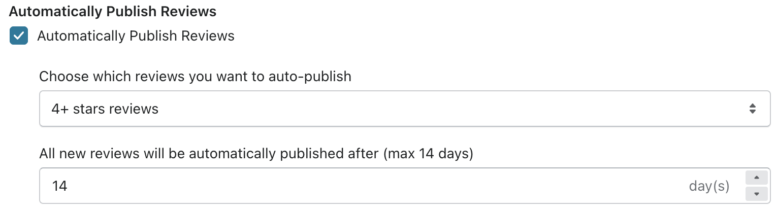 If the auto-publish setting is enabled, all new reviews will be automatically published in a maximum of 14 days. This additional setting ensures that reviews not meeting the initial auto-publish criteria will still be published after the specified period. The changes have taken effect starting 10th July 2024